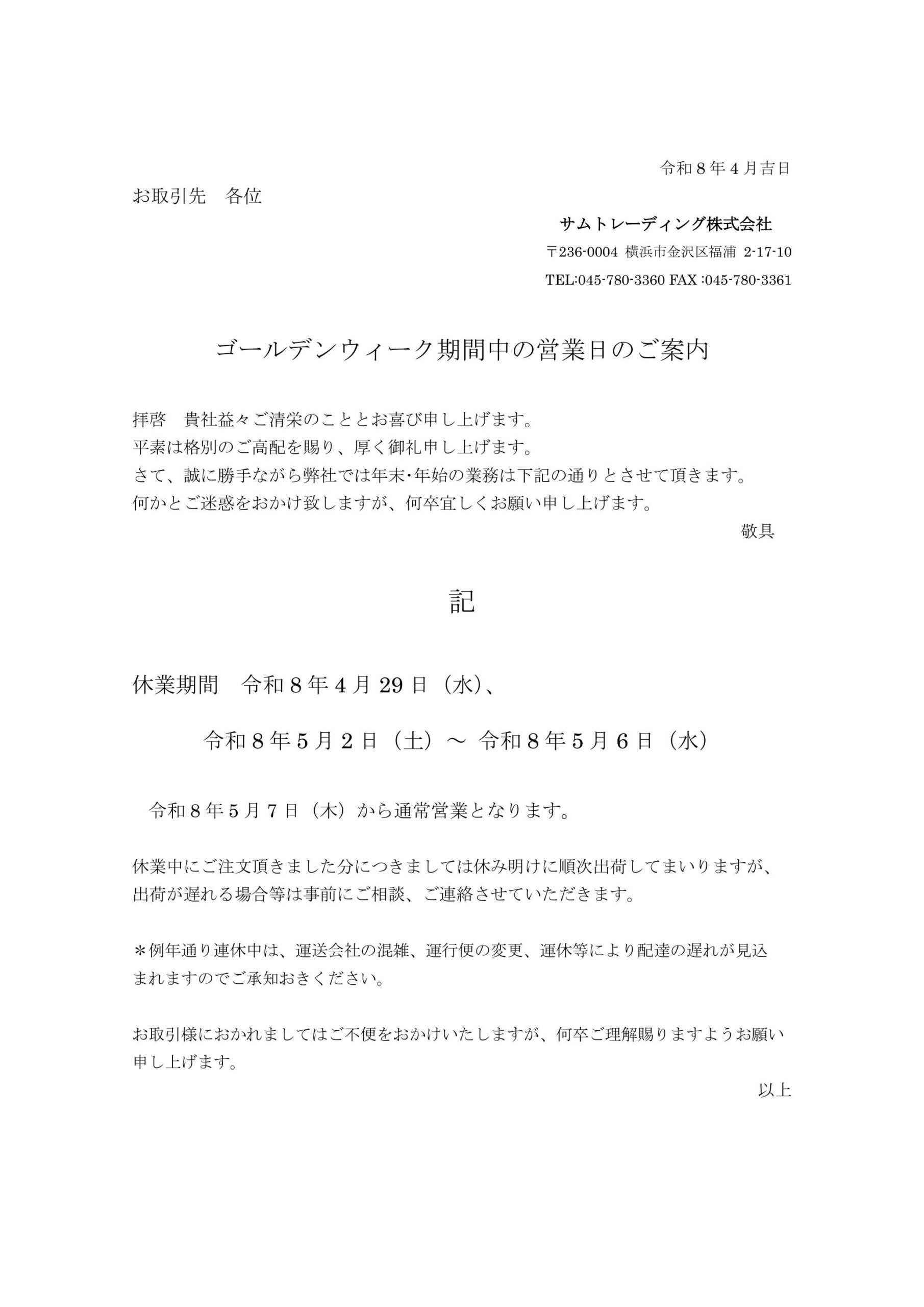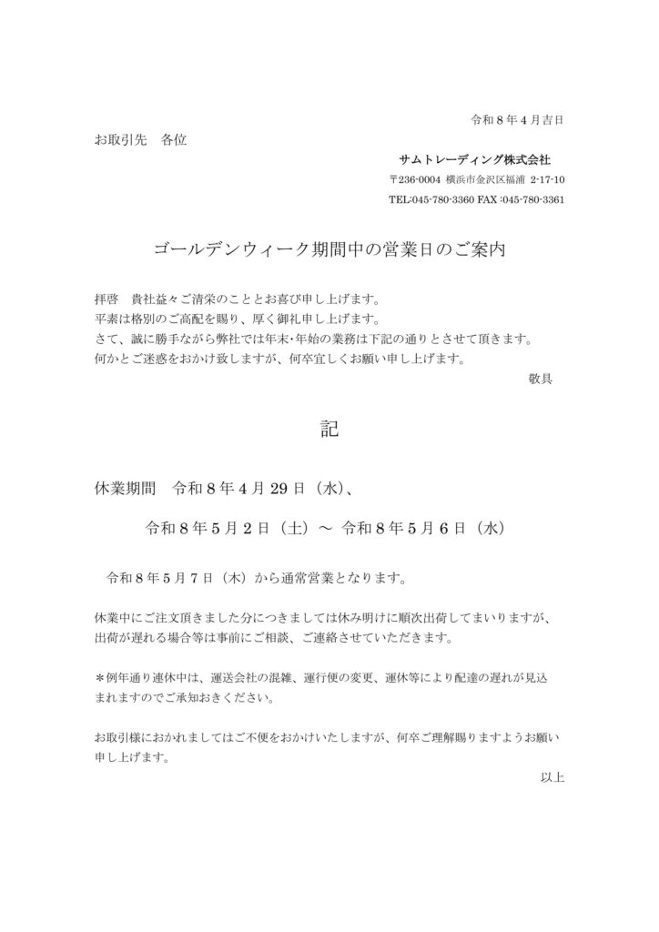 ゴールデンウィーク期間中の営業日のご案内