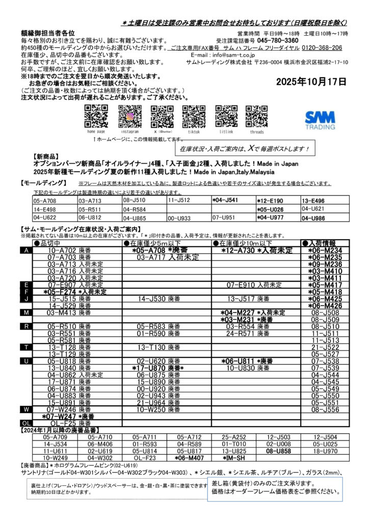 *NEW*サムモールディング入荷在庫状況2025年10月17日