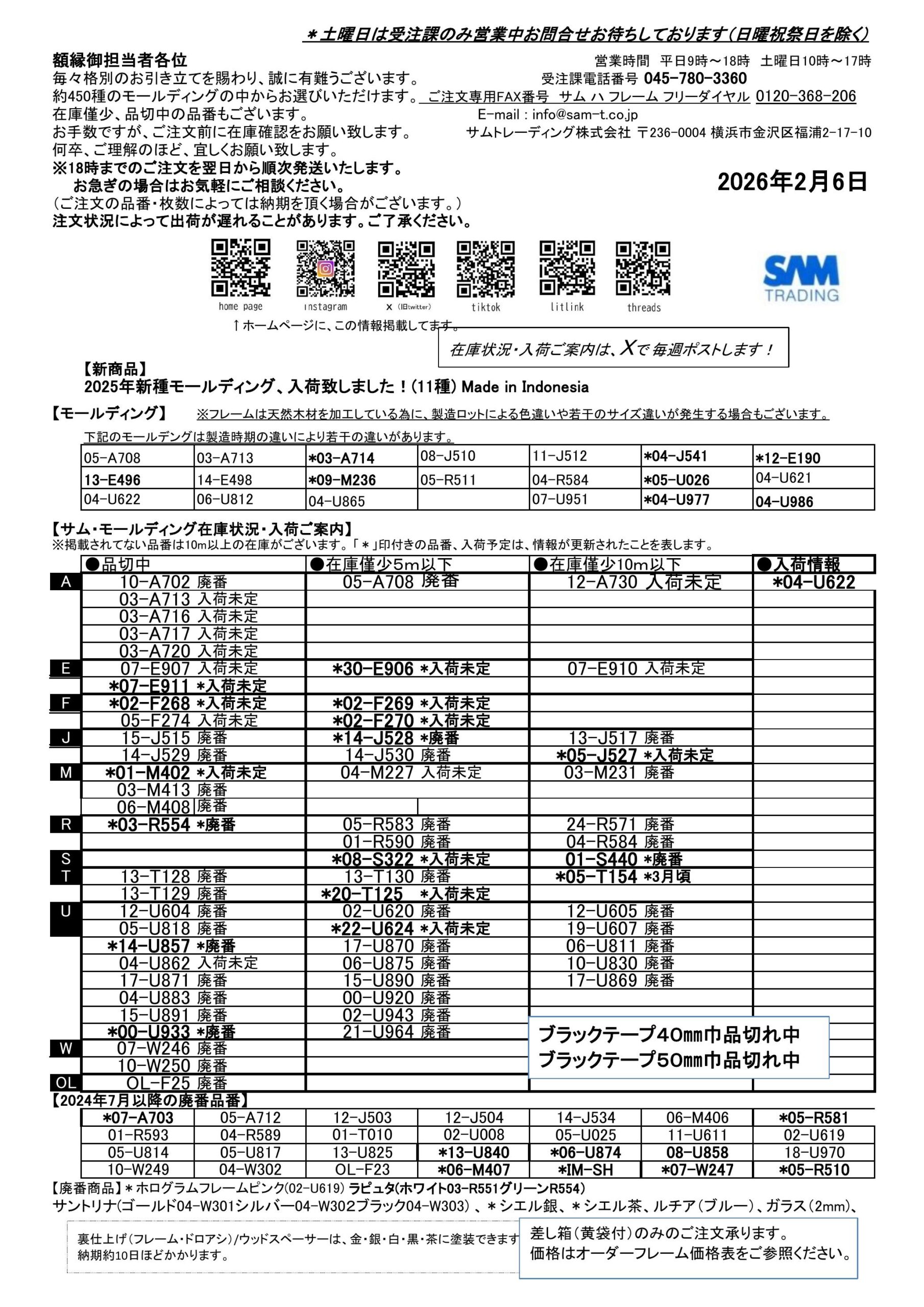 *NEW*サムモールディング入荷在庫状況2026年2月6日
