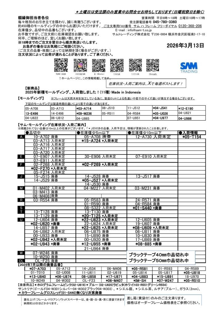 *NEW*サムモールディング入荷在庫状況2026年3月13日